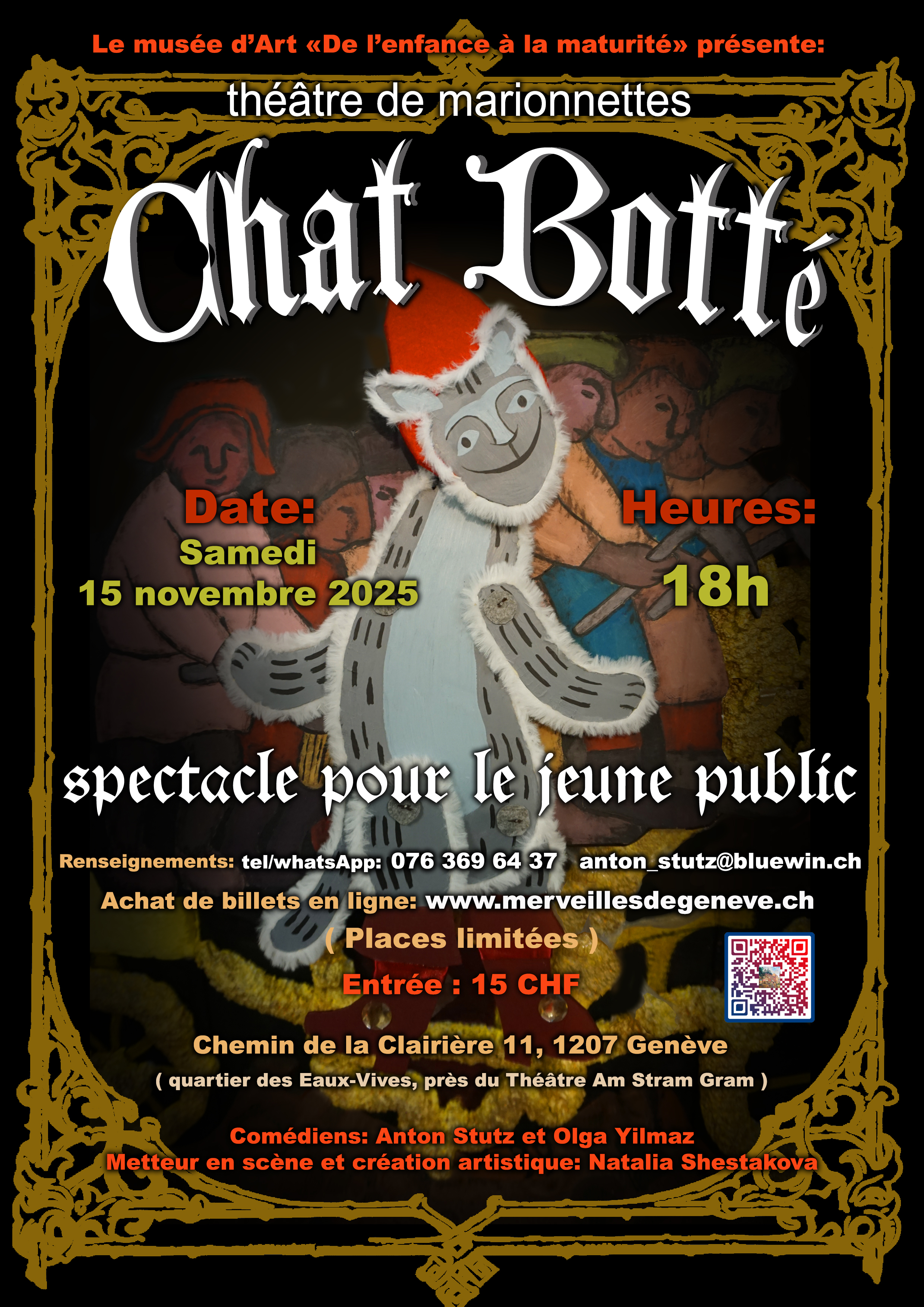 ( recommandé pour les enfants de 3-12 ans, les adults sont les bienvenus ) " Le Chat Botté " 11 chemin de la Clairière 1207 Genève ( à deux pas du Théâtre Am Stram Gram et de la Gare des Eaux-Vives )